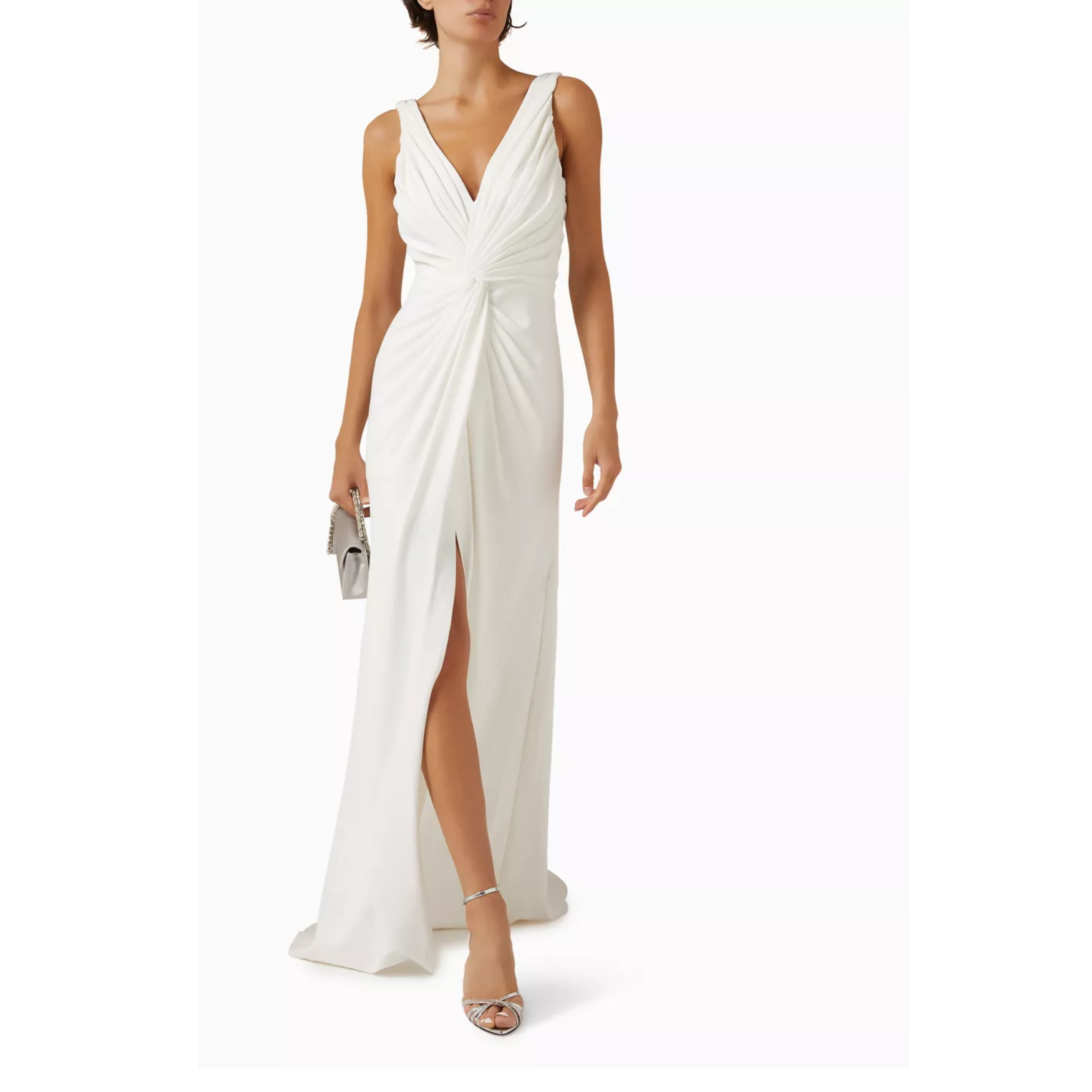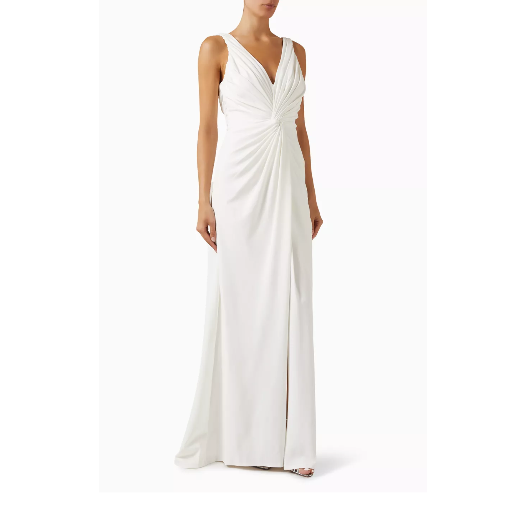 The Tadashi Shoji Jessey Twist-front Gown is designed with artful draping and a flattering twist detail that enhances your figure. Its deep V-neckline and floor-length silhouette create a timelessly polished look, making it the perfect choice for evening occasions and special celebrations.