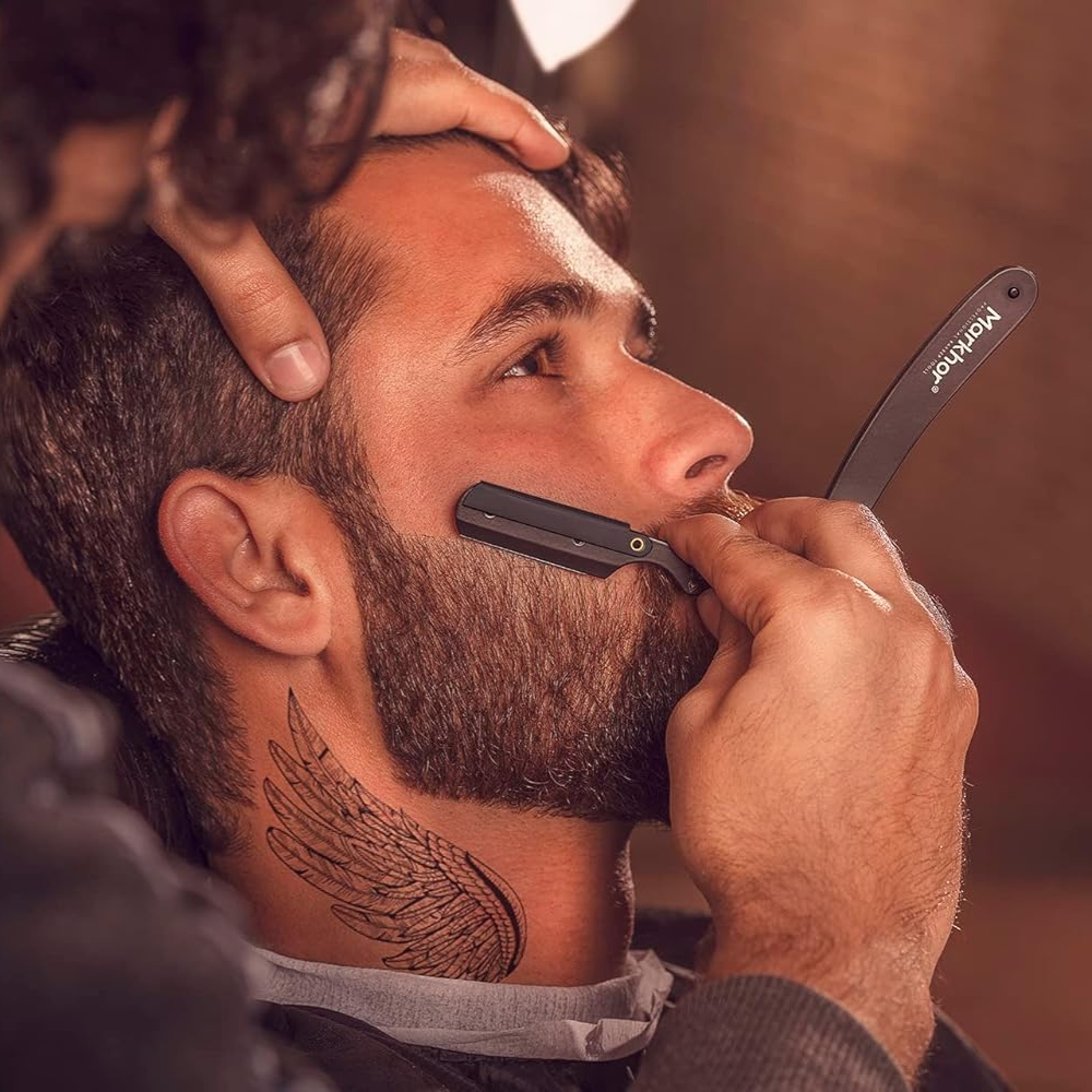 The MARKHOR® Matte Black Straight Razor offers a sleek, professional-grade shaving experience with its durable stainless steel build and matte black finish. Designed for both barbers and home users, it features a shavette-style system for clean, precise, and hygienic shaving.