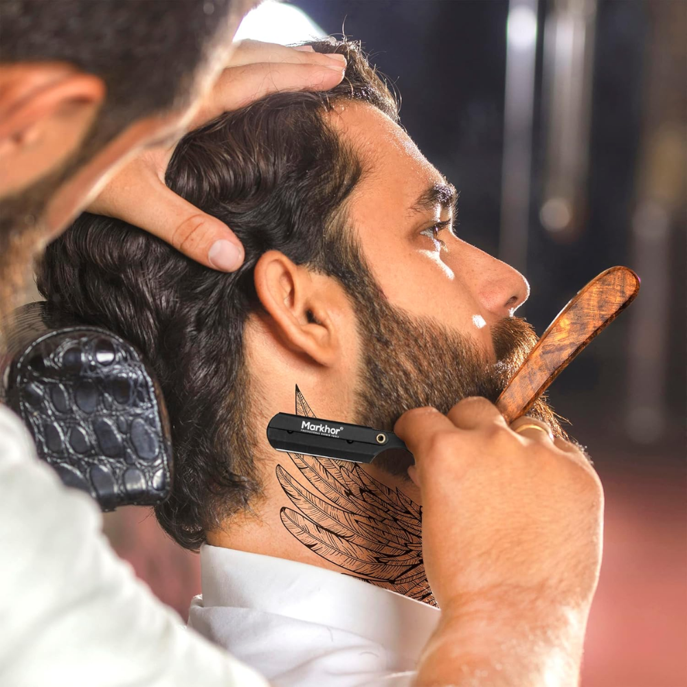 The MARKHOR® Black Rosewood Razor blends the warmth of real wood with the sharp performance of a shavette-style blade system. Designed for both barbers and enthusiasts, it offers comfort, control, and classic elegance.